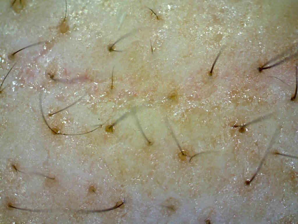 前頭部の所の髪がかなり少ないのと毛穴はあるけど全く「毛」が生えていないという感じに見えました。